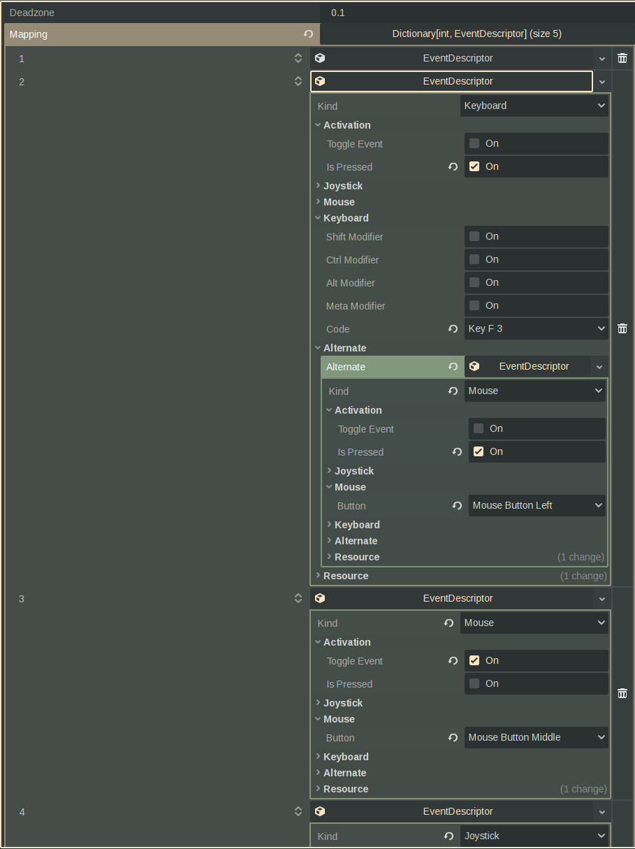 class_name SinglePlayerLogicalEventMapper extends Node signal on_action(action_id : int, activated : bool) @export var deadzone : float = 0.1 @export var mapping : Dictionary[int, EventDescriptor] = {} : set(value) : mapping = value _remap() var joybutton_press_event : Dictionary[JoyButton, int] = {} var joybutton_release_event : Dictionary[JoyButton, int] = {} var joyaxis_press_event : Dictionary[JoyAxis, int] = {} var joyaxis_release_event : Dictionary[JoyAxis, int] = {} var last_joy_axis_values : Array[float] var mousebutton_press_event : Dictionary[MouseButton, int] = {} var mousebutton_release_event : Dictionary[MouseButton, int] = {} var key_press_event : Dictionary[int, int] = {} var key_release_event : Dictionary[int, int] = {} func _ready() -> void: last_joy_axis_values = [] last_joy_axis_values.resize(JOY_AXIS_MAX) last_joy_axis_values.fill(0.) func _remap() -> void: joybutton_press_event.clear() joybutton_release_event.clear() joyaxis_press_event.clear() joyaxis_release_event.clear() mousebutton_press_event.clear() mousebutton_release_event.clear() key_press_event.clear() key_release_event.clear() for m in mapping: var action_id : int = m var descriptor : EventDescriptor = mapping[action_id] while descriptor != null: _add_mapping(action_id, descriptor) descriptor = descriptor.alternate func _add_mapping(action_id : int, descriptor : EventDescriptor) -> void: var toggle : bool = descriptor.toggle_event var pressed : bool = descriptor.is_pressed match descriptor.kind: EventDescriptor.EventMedia.JOYSTICK: if descriptor.joy_button != JOY_BUTTON_INVALID: var button : JoyButton = descriptor.joy_button if toggle: joybutton_press_event[button] = action_id joybutton_release_event[button] = action_id elif pressed: joybutton_press_event[button] = action_id else: joybutton_release_event[button] = action_id elif descriptor.joy_axis != JOY_AXIS_INVALID: var axis : JoyAxis = descriptor.joy_axis if toggle: joyaxis_press_event[axis] = action_id joyaxis_release_event[axis] = action_id elif pressed: joyaxis_press_event[axis] = action_id else: joyaxis_release_event[axis] = action_id EventDescriptor.EventMedia.KEYBOARD: var key : int = descriptor.key_code if descriptor.key_alt_modifier: key += KEY_MASK_ALT if descriptor.key_ctrl_modifier: key += KEY_MASK_CTRL if descriptor.key_shift_modifier: key += KEY_MASK_SHIFT if descriptor.key_meta_modifier: key += KEY_MASK_META if toggle: key_press_event[key] = action_id key_release_event[key] = action_id elif pressed: key_press_event[key] = action_id else: key_release_event[key] = action_id EventDescriptor.EventMedia.MOUSE: if descriptor.mouse_button != MOUSE_BUTTON_NONE: var button : MouseButton = descriptor.mouse_button if toggle: mousebutton_press_event[button] = action_id mousebutton_release_event[button] = action_id elif pressed: mousebutton_press_event[button] = action_id else: mousebutton_release_event[button] = action_id _: pass func _input(event : InputEvent) -> void: match event.get_class(): "InputEventKey": var kev : InputEventKey = event as InputEventKey if not kev.echo: var dict : Dictionary[int, int] = key_press_event if kev.pressed else key_release_event var key : int = kev.get_keycode_with_modifiers() if dict.has(key): on_action.emit(dict[key], kev.pressed) "InputEventMouseButton": var mev : InputEventMouseButton = event as InputEventMouseButton var dict : Dictionary[MouseButton, int] = mousebutton_press_event if mev.pressed else mousebutton_release_event if dict.has(mev.button_index): on_action.emit(dict[mev.button_index], mev.pressed) "InputEventJoypadButton": var jev : InputEventJoypadButton = event as InputEventJoypadButton var dict : Dictionary[JoyButton, int] = joybutton_press_event if jev.pressed else joybutton_release_event if dict.has(jev.button_index): on_action.emit(dict[jev.button_index], jev.pressed) "InputEventJoypadMotion": var jev : InputEventJoypadMotion = event as InputEventJoypadMotion var value : float = 0. if abs(jev.axis_value) < deadzone else jev.axis_value var activated : bool = not is_zero_approx(value) var last_activated : bool = not is_zero_approx(last_joy_axis_values[jev.axis]) last_joy_axis_values[jev.axis] = value if activated != last_activated: var dict : Dictionary[JoyAxis, int] = joyaxis_press_event if activated else joyaxis_release_event if dict.has(jev.axis): on_action.emit(dict[jev.axis], activated) _: pass